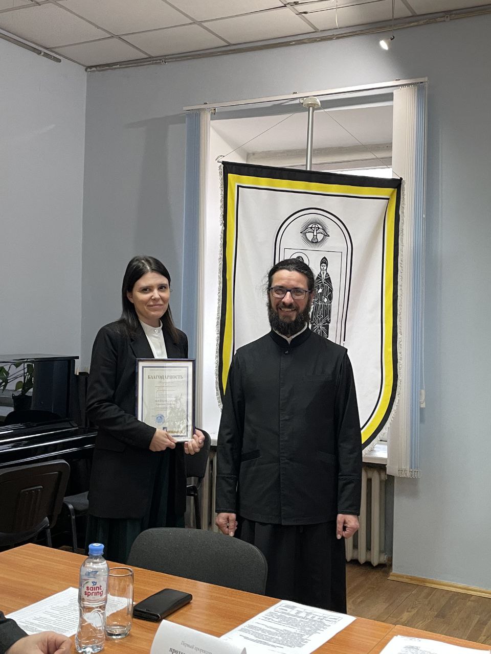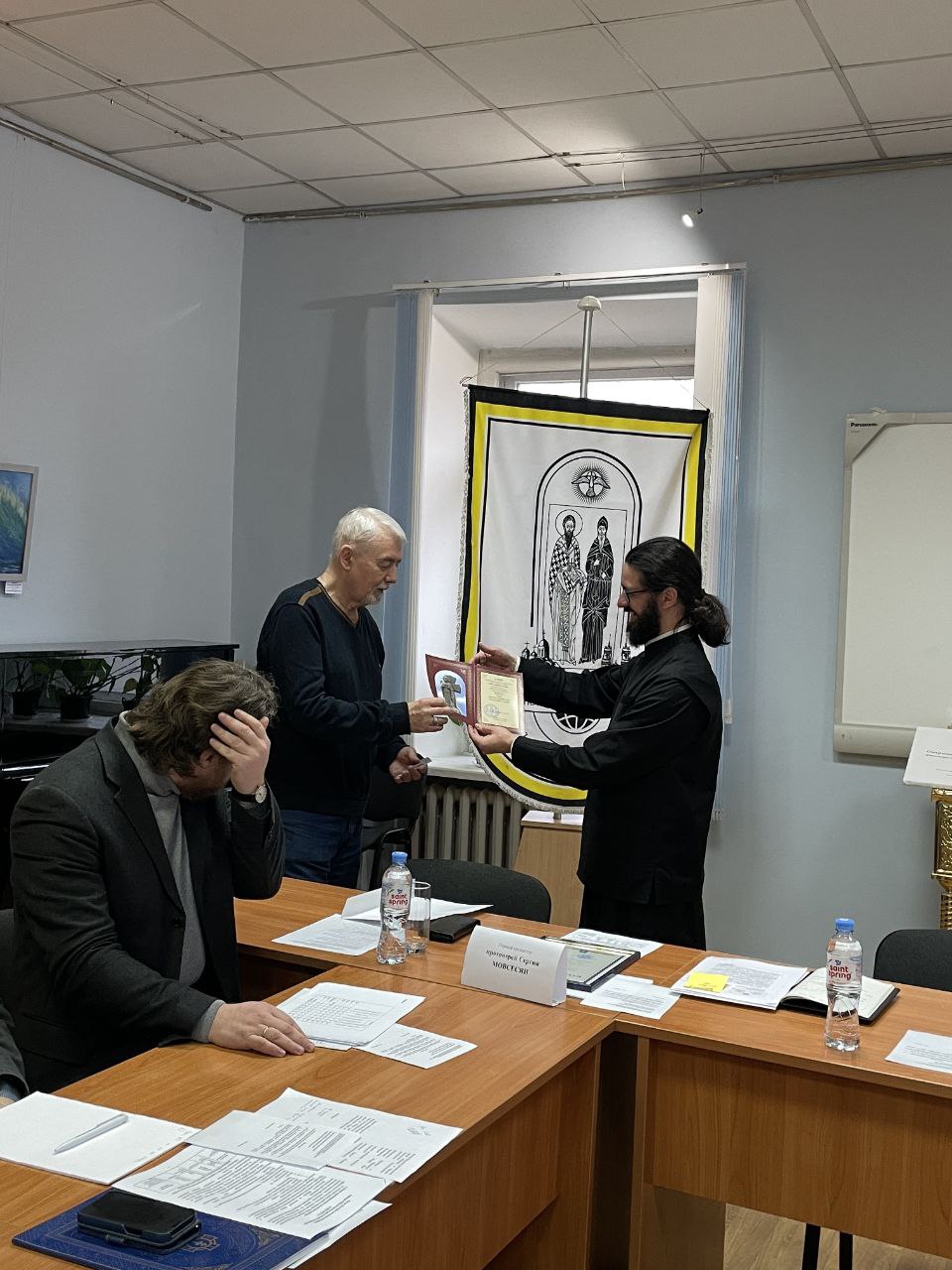 От имени Митрополита Вениамина первый проректор Института теологии БГУ протоиерей Сергий Мовсесян поздравил доцента кафедры религиоведения кандидата философских наук Николая Сергеевича Семёнова с 75-летием вручил ему медаль святителя Кирилла Туровского.